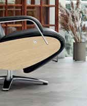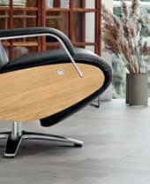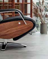 Verblendung: Kombinieren Sie massives Nussbaum oder Eiche mit den handpolierten Aluminiumarmlehnen und dem exklusiven Leder – oder wählen Sie mit gepolsterten Seitenteilen einen zeitlosen Look.