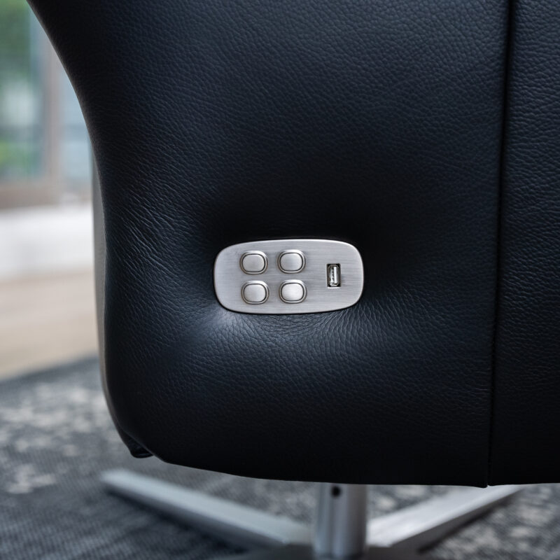 Motorische Bedienung über ein Bedienfeld mit Bedientasten und USB-Ladeanschluss an der Außenseite: