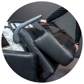 Die klappbare Armlehne ist wahlweise 10 cm oder 22 cm breit und kann in zwei Stufen (45 und 90 Grad) seitlich abgeklappt werden.